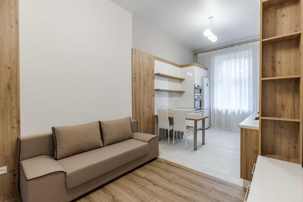 Вулиця Лемківська, початок. Пішком 5 хвилин – Оперний театр, ТРЦ Форум, Ашан, парк Високий замок, навчальні заклади, фінансові та медичні установи, дитячий садочок, продуктовий ринок тощо. ЯКІСНИЙ БУДИНОК Австрійський будинок на три поверхи. Повністю збережений фасад. З/б перекриття. По дві квартири на сходовій клітці. ВДАЛЕ ПЛАНУВАННЯ Квартира займає половину поверху. Дві великі сонячні кімнати (18,3м і 17,3м) на південь (три вікна та балкон на фасад), велика світла студіо (19м) на протилежну сторону. Стелі 3.30. Ізольовані санвузли, душова з вікном. Великий сухий підвал 14м.з віконцем на фасад. СВІЖИЙ РЕМОНТ Дизайнерський ремонт завершений в липні. Сучасний інтер’єр. Вмонтовані кухонні меблі, вся техніка брендових виробників. Шафа-купе в просторому коридорі.